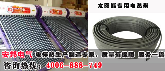 太陽能熱水器,作為一種新型成熟的熱水裝置,以其環保節能得到了廣泛的應用,同時又面臨一個難題,冬季氣溫低導致太陽能管道凍堵,甚至管道破裂,造成不必要的損失和浪費。對于這個難題,目前通用的方式,就是冬季排空太陽能管道,對人們正常使用太陽能造成的不便。而太陽能管道專用伴熱帶就可以幫您解決這個問題。 安邦牌太陽能專用伴熱帶由導線、PTC導電發熱材料、絕緣層三部分構成,是一款自限溫伴熱帶。其芯部分采用納米導電材料與高分子聚合物復合而成,均勻擠包在兩根平行金屬導線上,通過輻照交聯,具有在寒冷環境迅速升溫、啟動電流小,根據伴熱管道的溫度自動調節伴熱溫度,可以自由裁剪,無高溫過熱現象、便于安裝、維護方便等優點,是解決太陽能管道凍堵有效解決方案。